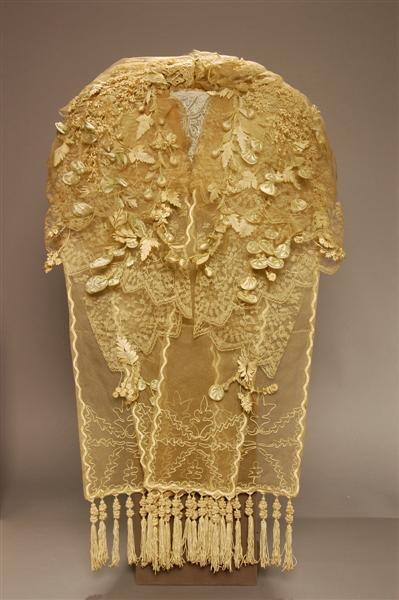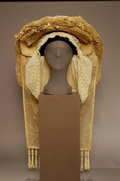 Romp en oren van grof, hard gesteven gaas. Romp verstevigd met dik laiton. Elastiekje aan romp. Langs de voorkant 2 op elkaar genaaide, geplooide kanten stroken. Langs de achterkant tussen de lavalieres, een enkel geplooid kanten strookje. Op de romp en versiering van tule, machinale tulen kant en kunstbloemen (vergeet-mij-nietjes, blaadjes en knopjes) Over de bloemen witte zijden batist. Lavalieres van tule met gaas, versierd met tamboereerwerk, veterband en een brede strook katoenen, machinale kant. Flossen van viscoserayon. Cavaliers op breedte gehouden door stevig laiton.