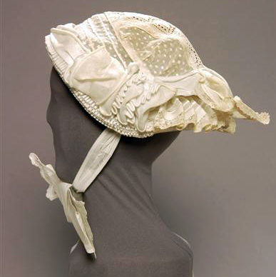 Wit mutsje van neteldoek. Langs de voorkant drie geplooide strookjes grof neteldoek. Pas (met drie koppeltjes) en bodem van genopt neteldoek. Entre-deux in de bodem van broderie-anglaise. Achterstrook (luifke) van grof geplooid neteldoek met twee koppeltjes en een aangezet machinaal kantje. Over de voorstroken en versiering van neteldoek met gerolde randen (aan de zijkanten in lussen gelegd en met geplooide strookjes versierd). Middenachter een strik en korte afhangende lintjes van gerold neteldoek. Langs de lintjes een tulen kantje. Kinstrikken van gesteven neteldoek met aan de uiteinden broderie-anglaise. Muts verstevigd met een band van gevlochten stro (en laiton?).