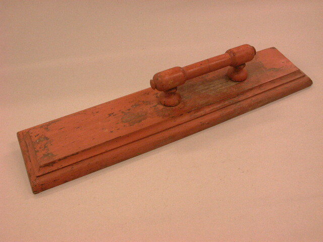 - BeschrijvingHouten mangelbord, oranjerose geschilderd (met uitzondering van de onderzijde) bestaande uit 4 losse onderdelen: -Plank met geprofileerde rand en aan de bovenzijde twee holtes voor een (excentrisch geplaatst) handvat. -2 staanders met een verbindende greep.