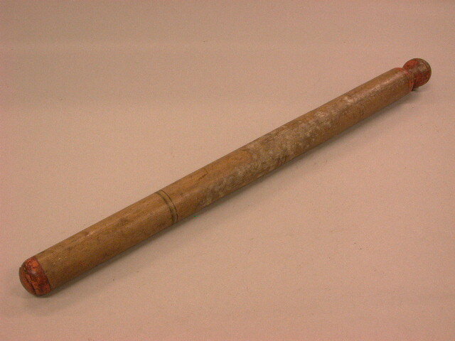 Houten mangelrol Lange cylinder met aan één uiteinde een knop (dit uiteinde is oranje-rose geschilderd).
