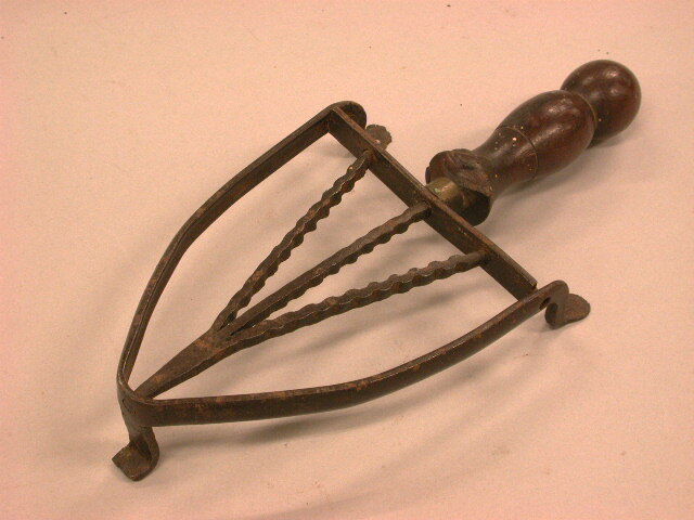 - BeschrijvingStrijkertreeft, puntige voorzijde, rechter spiegel, geen opstaande rand -bodem: eenvoudig levensboommotief, omgebogen en afgeplatte pootjes, gedraaid houten handvat.