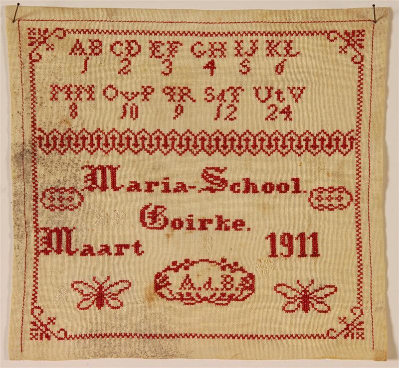 Witte katoenen lap met kruisteekborduurwerk in rode katoen. Bovenaan het alfabet in groepjes van 2 letters. Tussen O en P een v, tussen S en T en d en tussen V en V een t. Onder de lettergroepjes de cijfers 1 t/m 8, 10, 9, 12 en 24. Daaronder een fantasierandje en de tekst "Maria-School/Goirle/. Maart 1911/A.d.B.". "A.d.B "in cartouche, tussen 2 vlinders. Over de lap verspreid, in wit, 4 maal de letter "B". Om het geheel een zigzagrandje met hoekversieringen. Langs de 3 zijden omzoomd met rood garen.