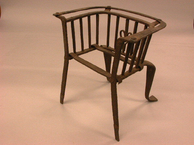 - BeschrijvingRechthoekig, U-vormig brandijzer op hoge poten en met een bodem van spijlen. In de voorzijde is een hartje gesmeed