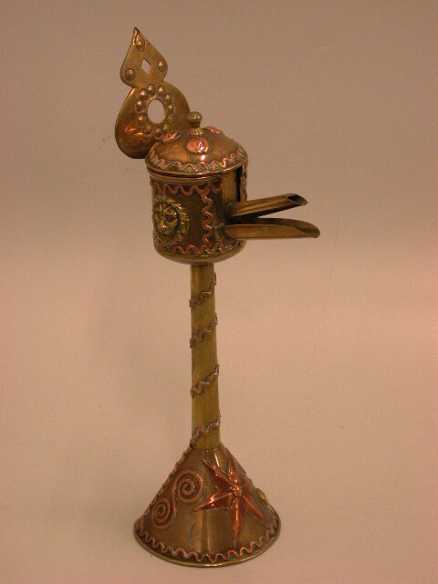 - BeschrijvingGeelkoperen snotneus met roodkoperen decoratie. Cilindrische lampekop: bak met rechte tuit in een huis met snuitstuk, deksel met knop, wandplaat met ophangoog. Cilindrische stam. Verzwaarde voet. Huis, deksel, stam en voet zijn gedecoreerd met rood koper. Drie leeuwekoppen zespuntige slingerende ster.
