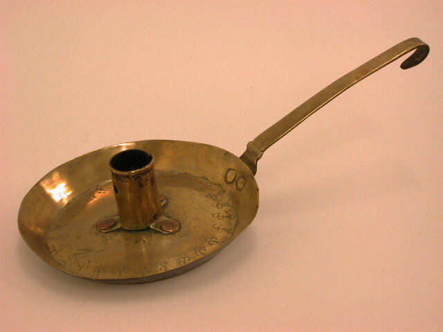 Geelkoperen blaker. Ronde schaalvormige vetvanger. Geknipte platte steel olie eindigt in een haakje. Huls: cilindrisch gevormde koperen band, gesloten, met rond gat middenvoor die door midden van drie lipjes op de bodem van de vetvanger is vastgeklonken. Decoratie: bandversiering langs de huls en op de bodem van de vetvanger.