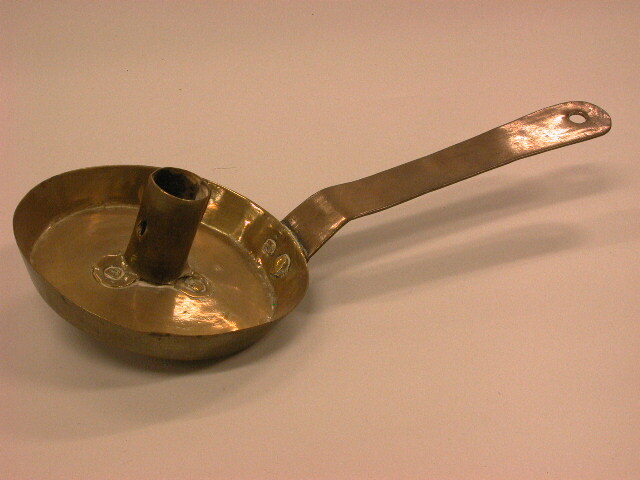 - BeschrijvingGeelkoperen blaker met steel. Ronde schaalvormige vetvanger. Geknipte platte steel met ophangoog. Huls: cilindrisch gevormde koperen band, die met drie lippen op de op de bodem van de vetvanger is vastgeklonken. Een rond gat in het midden van de band (middenvoor) vergemakkelijkt het verwijderen van de kaars.