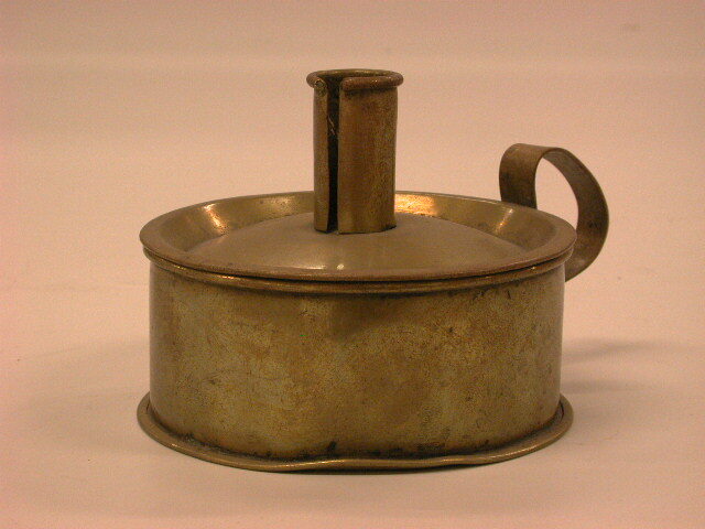 - BeschrijvingGeelkoperen handblaker. Ronde gesloten bak met opstaand randje als vetvanger. Staand gebogen oor. Huls cilindrisch gevormde koperen band met gleuf, die door de bovenkant van de vetvanger is heengestoken. De gleuf en het gat in de band (middenvoor) vergemakkelijken het verwijderen van een kaarsstompje.