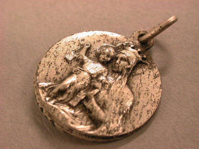 - BeschrijvingRond met oogje en ringetje. Voorzijde: zittende, gekroonde Maria met kind, scapulieren uitdelende. Keerzijde: H. Hart ten halve.