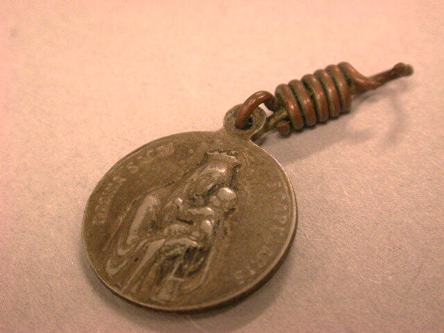 - BeschrijvingRonde medaille met getordeerd haakje door oogje. Voorzijde: gekroonde Maria met kind en scapulier, sterrenrand nimbus van Maria. Omschrift: "REGINA SACRI/SCAPULARIS". Keerzijde: H.Hart met kruisnimbus, borsthoogte omschrift: "O MI +JESU/+ MISERICORDIA!".
