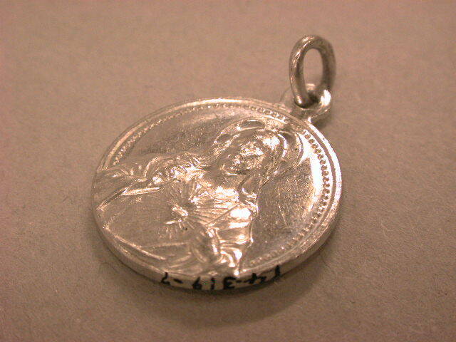 - BeschrijvingRond met oogje en ringetje. Voorzijde Maria met kind beide met aureool en scapulieren uitdelend. Omschrift: "VIRGO CARMELI". Parelrand binnen geprofileerde rand. Keerzijde: H. Hart ten halve. Parelrand binnen geprofileerde rand. Aan beide zijden randen onderbroken door onderzijde voorstelling.