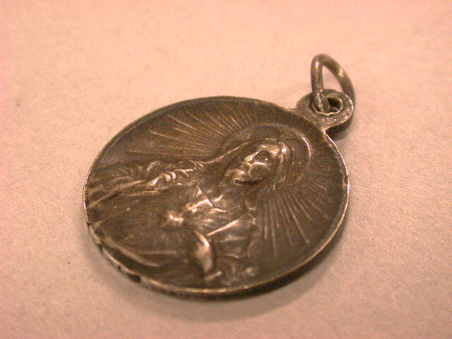- BeschrijvingRond met oogje en getordeerd haakje. Voorzijde-Op rots tronende Maria met kind en scapulier verschijnen aan de geknevelde H.Simon Stock (Engels Carmelier 1164-?) Omschrift:"VIRGO/CARMELI" Keerzijde.: H. Hart ten halve met stralen rond aureool. Zie LM998.9: zonder haakje, met ringetje.