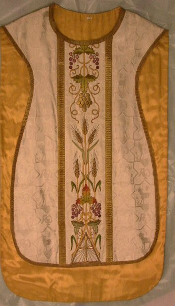 Kazuifel in vioolkistvorm van witte zijden damast. In verspringende stervormige kontouren, het Lam Gods op een grondje met bloemen. Boven het Lam het Christusmonogram PX. In de ruimten tussen de 'sterren' Alfa en Omega (A en W). Midden voor een kolom van witte zijde versierd met borduurwerk in veel kleuren zijde (kettingsteek) en gouddraad, en reliƫf goudborduurwerk. Het patroon bestaat uit korenaren, druiventrossen en een driehoek waarin een kruis. Op de rugzijde een latijns kruis in hetzelfde materiaal met hetzelfde patroon en in dezelfde techniek als toegepast in de kolom middenvoor. Op het kruispunt van de balken een medaillon van gele zijde met goud- en zijdeborduurwerk. In het midden het gekroonde hoofd van Christus. Het hoofd is geborduurd in platsteek, in natuurlijke kleuren. Om het hoofd een rand met "REX" "REGUM", A en W en 2 kruisjes. Kolom en kruis zijn omrand met breed goudband met blokjesmotief. Het kazuifel is afgezet met smal goudband met blokjesmotief. Gele voering in keperbinding van viscoserayon.