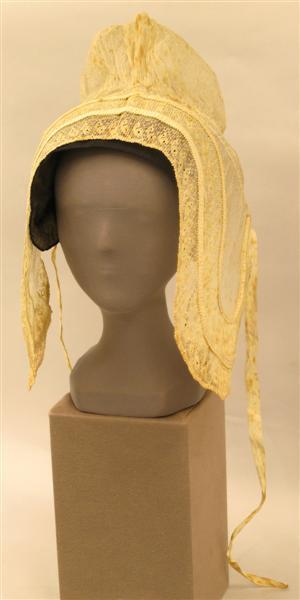 Witte katoenen trekmuts/spanmuts. Bodem van witte katoenen tule met doorstopwerk, eenbloemig patroon. Aan de voorkant in de bodem aan een smal machinaal kantje de pas gezet. Boven op het hoofd is de bodem gerimpeld. Langs de onderkant zijn van dik garen lussen genaaid. Door de lussen zijn 2 katoenen banden geschoven. De voorstrook bestaat uit neteldoek en 2 stroken machinale kant. De breedte van de strook (neteldoek, waarlangs een strook kant) loopt 8.5 cm van boven op het hoofd uit tot 24 cm ter hoogte van de kin. Op het neteldoek is langs de daar reeds aangenaaide kant de tweede strook zelfde kant genaaid. De hele voorstrook is zeer hard gesteven en fijn geplooid (waarschijnlijk met het plooiplankje). Langs de voorkant is door de plooitjes een katoenen draad geregen. Op de beide randen van de 2e kant zijn fantasiebandjes genaaid: een smal aan de achterkant en een breder aan de voorkant. Langs de pas is ter hoogte van het linkeroor een rood draadje ingenaaid.