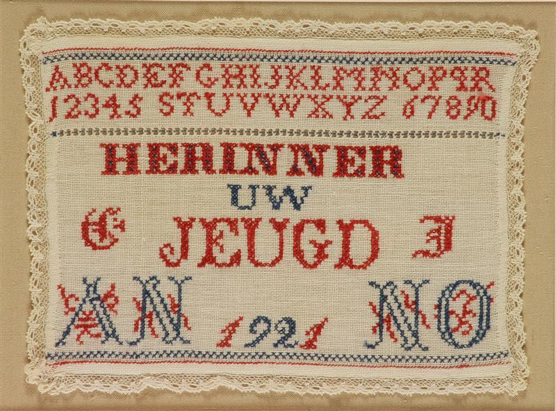 - BeschrijvingWitte katoenen lap. Geborduurd met rode en blauwe katoen in kruissteek. Een open randje met blauwe draad. Een alfabet, eenmaal de cijfers 1 t/m 9 en 0. In het midden de tekst: 'HERINNER UW JEUGD', de lettes 'G' en 'J' en daaronder 'ANNO 1921'. Het lapje is omzoomd met een tulen kantje