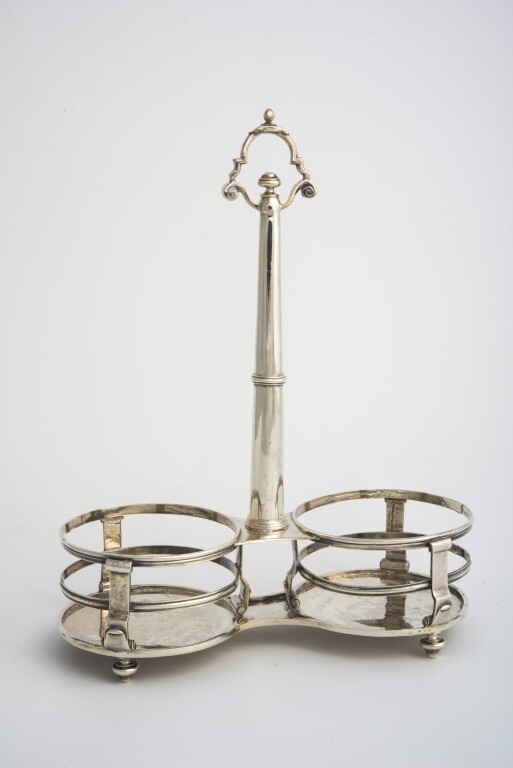 Twee houders voor olie- en azijnstel in de vorm van een balans. Op achterzijde Groot-Gasthuis-kruisje. Houders met dichte bodem en twee smalle, geprofileerde banden. Ronde stam, bekroond met handvat met Lodewijk XIV-ornamentiek. Bijhorende flacons ontbreken.