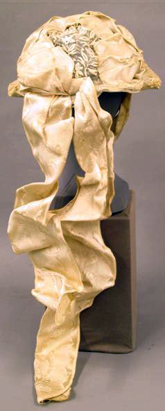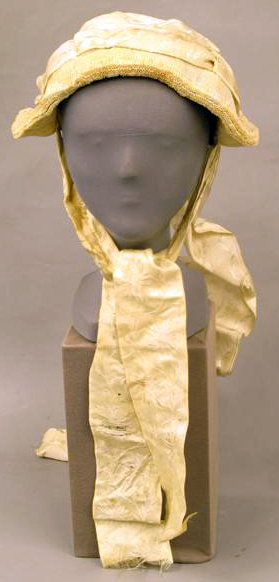 Bodem, drie geplooide voorstroken en luifke van witte tule. Bodem versierd met plumetis-borduurwerk. Crême-kleurige viskose-rayon linten met bloemmotief over de muts geplooid en vastgespeld. Aan de achterzijde twee afhangende linten. Zijden striklinten met bloemmotief. Binnenkant bodem zwarte, hard gesteven tule. Rand van bodem verstevigd met ijzerdraad en stro.
