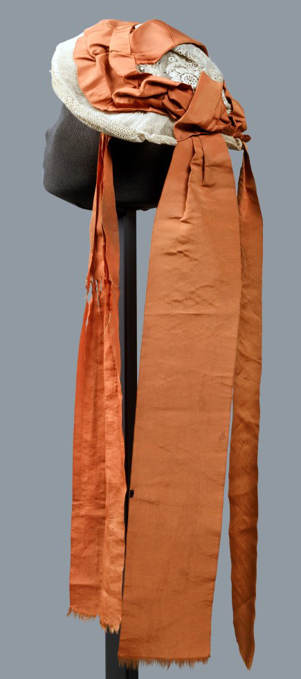 - BeschrijvingBodem, drie geplooide voorstroken en luifke van witte tule. Bodem versierd met plumetis-borduurwerk. Bruine rib-zijden linten over de muts geplooid en vastgespeld. Aan de achterzijde twee afhangende linten. Twee striklinten. Binnenkant bodem zwarte, hard gesteven tule. Rand van bodem verstevigd met ijzerdraad en stro.