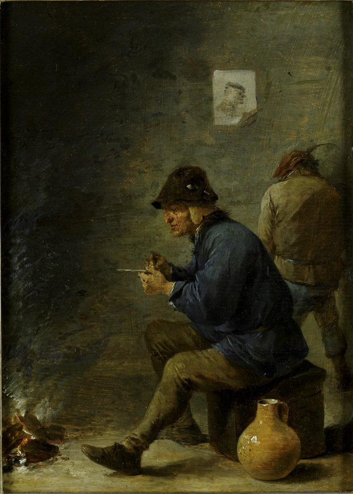 - BeschrijvingEen zittende man in een schuur bezig met het stoppen van zijn pijp. Achter hem staat een plassende man. Aan de muur hangt een tekening van een hoofd.