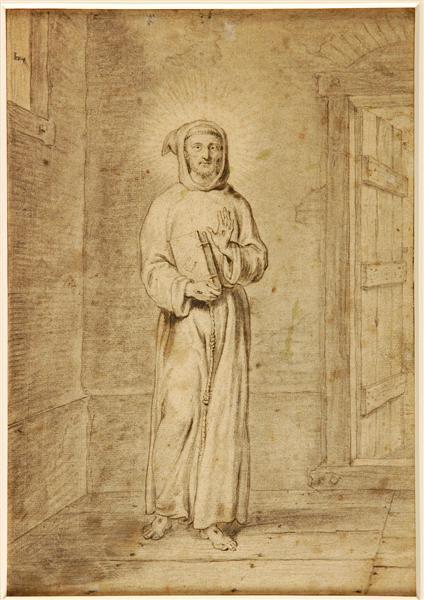 - BeschrijvingDe heilige Franciscus staande in een kloostercel, een stralenkrans rond zijn hoofd, toont de stigmata, houdt in de rechterhand een boek.