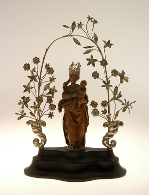 - BeschrijvingMaria met kind op de linker arm, staande op een verbreed voetstuk waaruit aan weerszijden een zilveren bloemenkrans opbloeit uit een hoorn des overvloeds. Maria draagt een zilveren kroontje van later datum.
