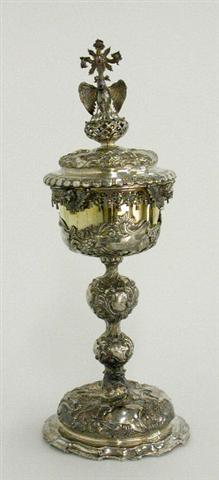 - BeschrijvingStam met twee nodi. Op de voet de Heilige Augustinus, op de deksel een drie jongen voedende pelikaan, zittend op een doornenkroon.