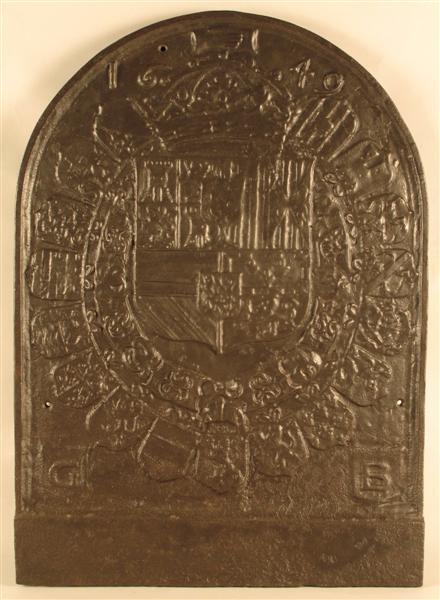 - BeschrijvingHaardplaat met wapen van Filips IV, omgeven door de keten van het Gulden Vlies en daaromheen de wapens van de Zeventien Provinciƫn, met het jaartal 1649 en het monogram GB. De haardplaat heeft een ronde bovenzijde.