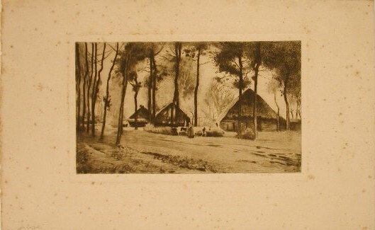 - BeschrijvingGezicht op twee boerderijen en een schuur, alle drie met een rieten dak, langs een brede zandweg gelegen. Langs de weg en bij de gebouwen staan bomen. In het midden loopt een boerin met twee koeien.