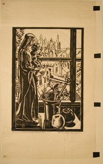 - BeschrijvingOp een tafel voor het raam staat een Mariabeeld. Maria heeft het Kind Jezus op de arm, Jezus heeft de rijksappel in de hand. Verder staan op de tafel nog een vijzel en twee appels. Door het raam ziet men uit over de daken. Op de achtergrond is de St. Janskathedraal van 's-Hertogenbosch te zien.
