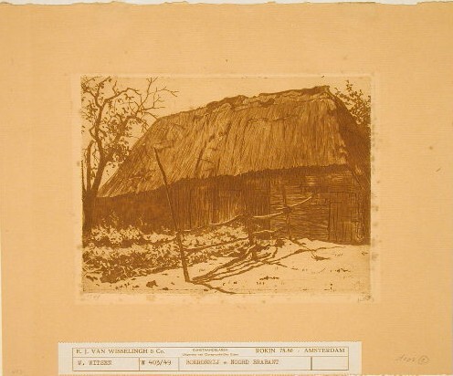 - BeschrijvingEen boerenschuur, in de lengte gezien, met een strooien dak en grotendeels strooien wanden. Twee dubbele deuren in het midden en twee enkele deuren midden en rechts. Links staat een boom, midden op de voorgrond een hek.