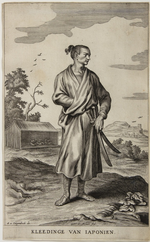 Afgebeeld is een man, gekleed in een ruim om het lichaam geslagen kleed met een ceintuur. Om de benen heeft hij banden die overgaan in een soort sandalen. Aan zijn linkerzijde heeft hij twee zwaarden. Linksachter staat een gebouwtje met een open ruimte waarin vijf personen bijeen zitten op de vloer, met onder het lichaam getrokken benen. Op de achergrond een watervlakte en een berg met bouwwerken.