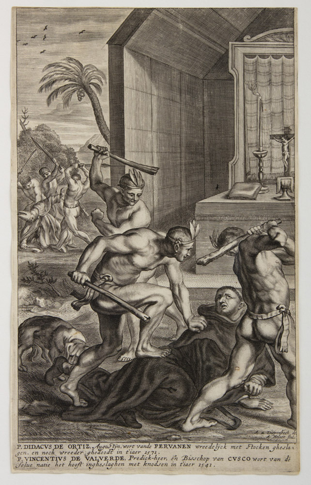 Marteldood van Paters Didacus de Ortiz, Augustijn en Vincentius de Valverde, bisschop van Cusco, in Peru in het jaar 1541. Op de voorgrond wordt een pater door drie nagenoeg naakte mannen met knuppels bewerkt en door een hond gebeten. Op de achtergrond wordt een bisschop door drie mannen met een soort korte speren geslagen. Rechts een gebouw, aan de voorkant open zodat men daarin een altaar met kelk en crucifix kan zien.