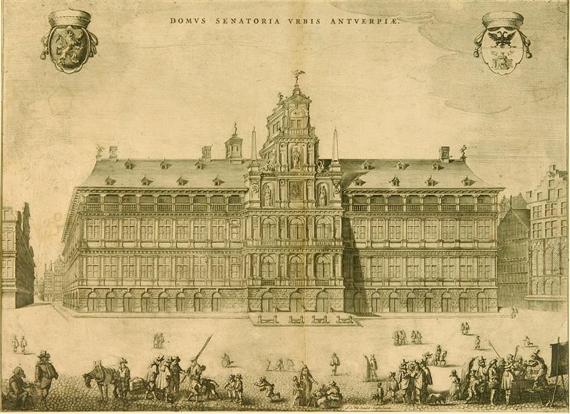 Afgebeeld is het stadhuis van Antwerpen. Op de voorgrond bevinden zich groepjes burgers en kinderen bij o.a. kooplieden, een groentekraampje en een paardenslee. Rechtsboven het wapen van Antwerpen op een eenvoudig schild. Linksboven op een eveneens eenvoudig schild het wapen van een leeuw, naar rechts gewend. Opschrift: DOMVS SENATORIA VRBIS ANTVERPIAE.