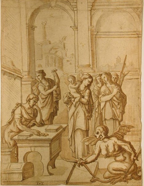 In een klassiek aandoende omgeving, zit aan een bureau in een grote kamer, een man met zijn rechterhand geld tellend. Op de voorgrond rechts een duivels figuur met drakepoten en -staart. In zijn linkerklauw een pijl, in zijn rechter een boog, zijn hoofd heeft iets weg van een doodskop. Voor het bureau vier vrouwen, gekleed in tunica's, in bange afwachting. Op de achtergrond een tekst: "Ende dan pratiseert hij hoe hij die nue wel bestelden mach/om sijn rekeninge te maeken, en erst geboene hope ende lieffde/die ontrent hem staan, ter weijlen die doot wach naer det het/kindeken euure staen sal".