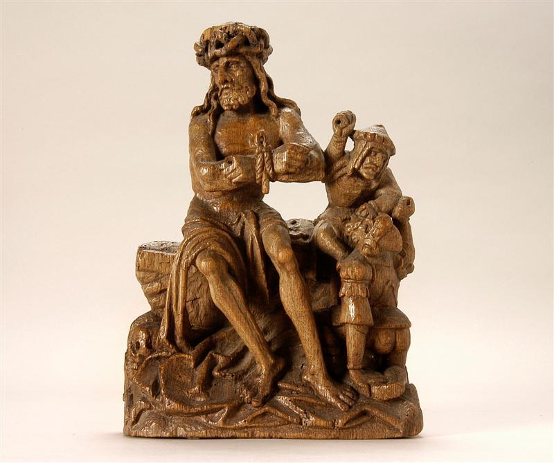 - BeschrijvingChristus, naakt op een lendendoek met een doornenkroon met ijzeren doornen op het hoofd, de handen geboeid, is op een verhoogd gedeelte van het terrein gezeten. Rechts van hem vechten twee krijgslieden, links op de grond een schedel en beenderen.