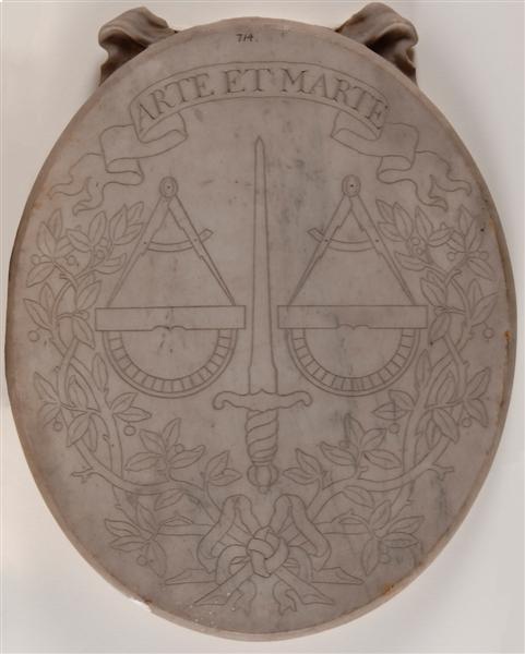 Medaillon met meetkundige instrumenten en een zwaard in een lauwerkrans
