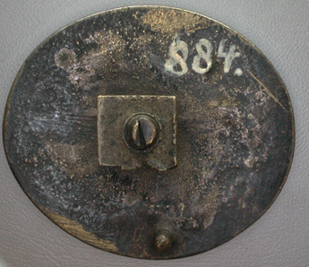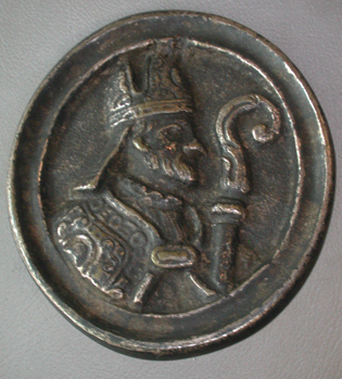 - BeschrijvingOvale plaquette met aan de achterzijde een bout met vierkante moer en een klein uitsteeksel. de voor zijde een geprofileerde rand en op een verdiept veld een afbeelding van een bisschop met mijter en kromstaf.