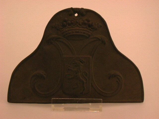 - BeschrijvingGolvende bovenlijn op rechte basis. Ingeperste decoratie: Wapen met gekroonde, staande leeuw met zwaard en pijlenbundel op rood veld, staand voor gekroonde zwenkende M. Volgens inventarisboek vermoedelijk van regiment mariniers in dienst der Republiek (sic) der Verenigde Nederlanden.