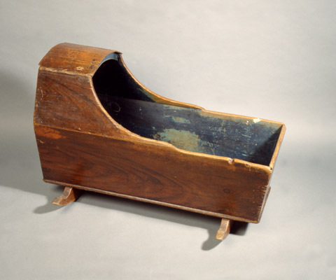 - BeschrijvingHouten wieg met kap, van buiten rood, van binnen blauw geverfd. Kribbevormige bak op twee vaste aangehechte kromme voeten, schommelwieg. De wanden staan schuin i.p.v. verticaal. Kap van houten planken, naar boven smaller van vorm.