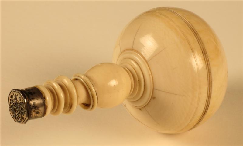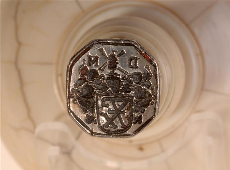 Achthoekig zilveren zegelstempel met huismerk: een accoladevormig schild met daarop een huismerkteken. Het schild wordt gedekt door een traliehelm met als helmteken een molen. Rondom versierd met de pluimen van de helm. Aan weerszijden van de molen de initialen M D. Aan de zegelstempel is een groot ivoren handvat bevestigd, met een gelijktijdig gesneden ringetje er omheen.