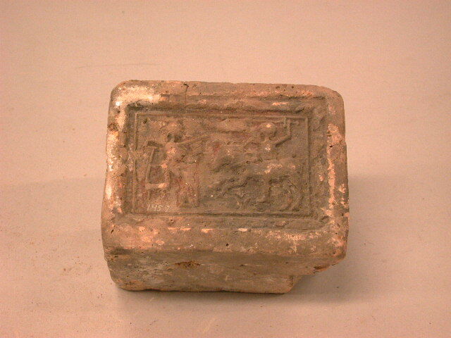 - BeschrijvingSt. Maarten te paard (rechts), zijn mantel met zwaard in tweeën delend voor bedelaar op krukken (links). Halfbrede rand, met meanderlijst. Sporen van rode beschildering.