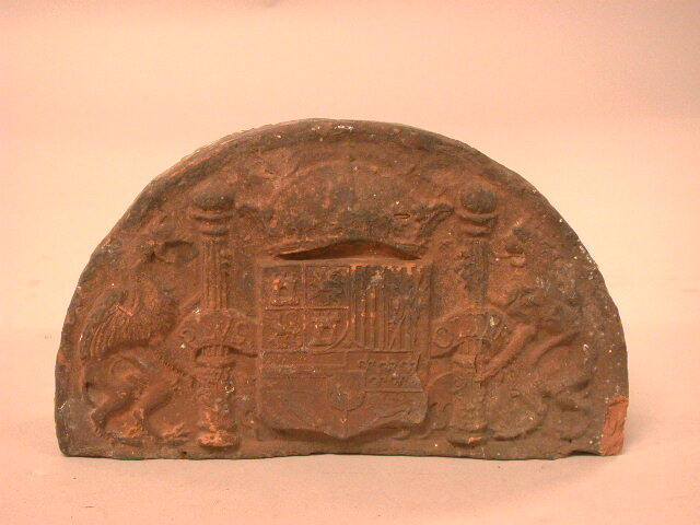 - BeschrijvingHalfronde haardsteen met het gekroonde wapen van Philips II tussen de twee zuilen van Hercules, waar rond op band het devies PLUS OLTRE, en twee dragers. Links een griffioen, rechts een leeuw. Langs de bovenzijde het jaartal (15(56?)
