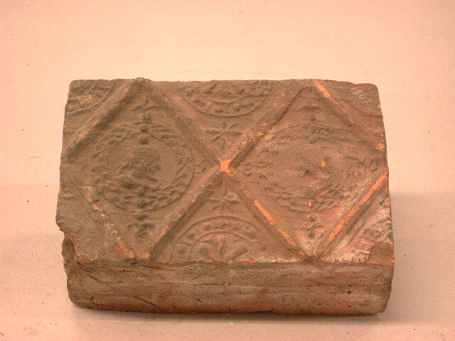 - BeschrijvingDoorlopend patroon met twee staande ruiten, waarin twee rode medaillons, met de toegewende hoofden van een man (l) en een vrouw (r), en het jaartal 1580.