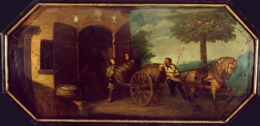 - BeschrijvingVoorstelling van mannen die biervaten uit een schuur op een wagen laden, getrokken door een paard. Waarschijnlijk afkomstig van een brouwerij te Gemert