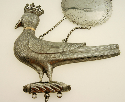 - BeschrijvingGekroonde vogel/papegaai staande op tak, vanaf de rug d.m.v. twee kettinkjes verbonden met medaillon, hol, half plat. Vanaf de tak onder met een haakje verbonden met schild. Om de nek van de vogel/papegaai is een koperen band bevestigd. Onder de tak zijn drie ronde haken bevestigd.