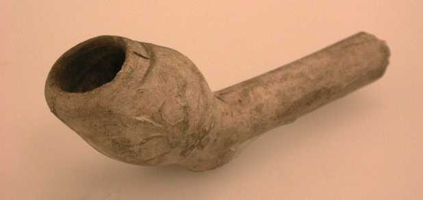 Aardewerk rookpijpje van lichtgekleurde pijpaarde met bloemornamenten