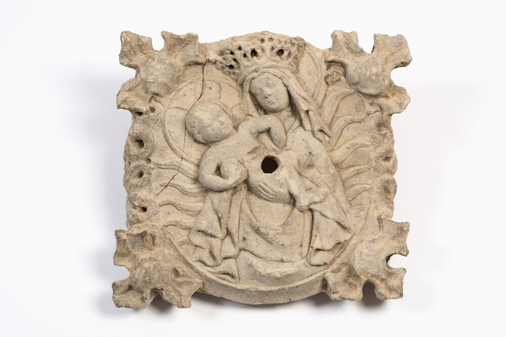 Vierkante sluitsteen, waarvan de hoeken door gestileerde bladeren worden gevormd, met voorstelling van Maria met het Kind als de Apocalyptische vrouw, bekleed met de zon, en staande op de maansikkel. Zij draagt een sluier en een kroon en is omgeven door een wolkenband. De voorstelling is gevat in een rechthoek, waarvan de vier hoeken worden gevormd door een gestileerd bladmotief. Rond gat in het midden van de steen.