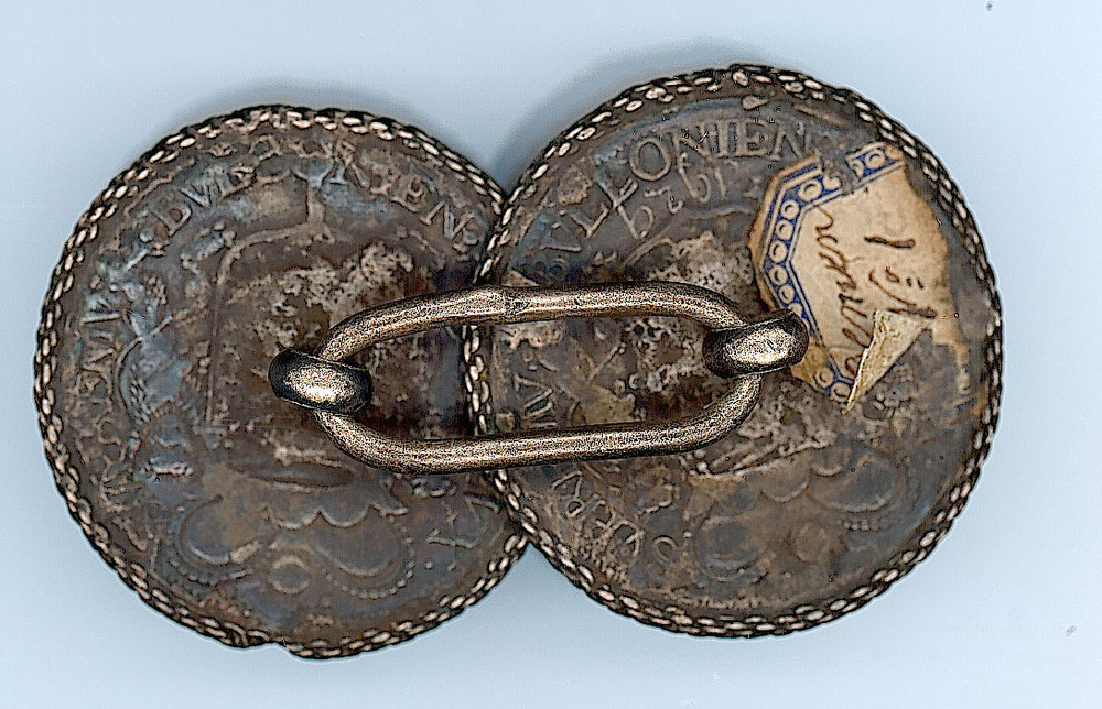 Stel broeksknopen vervaardigd uit twee Luikse kronen, geslagen onder bisschop Maximiliaan Hendrik van Beieren (1650-1688). De munten zijn aan de keerzijde verbonden door een schakel.