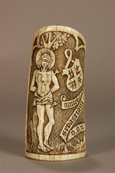 - BeschrijvingPolsbeschermer voor de handboogschutters met voorstelling van de gemartelde St. Sebastiaan. Banderol met de inscriptie: 'SANCTE / SEBASTIANI/ O.P.N.".