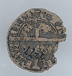 - BeschrijvingVoorzijde: binnen een parelrand een klimmende leeuw, met omschrift. Keerzijde: lang gevoet kruis dat door de binnenste parelrand heen snijdt, en het blanco vlak in vieren deelt, met omschrift.