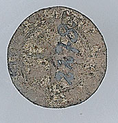 - BeschrijvingVoorzijde: binnen een parelrand een kop naar links, onleesbaar omschrift. Keerzijde: lang gevoet kruis dat binnen een parelrand een blanco vlak in vieren deelt, met omschrift.